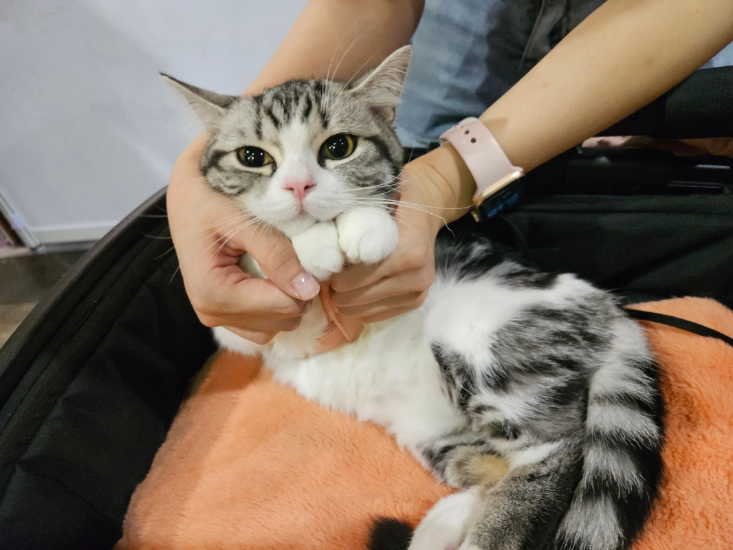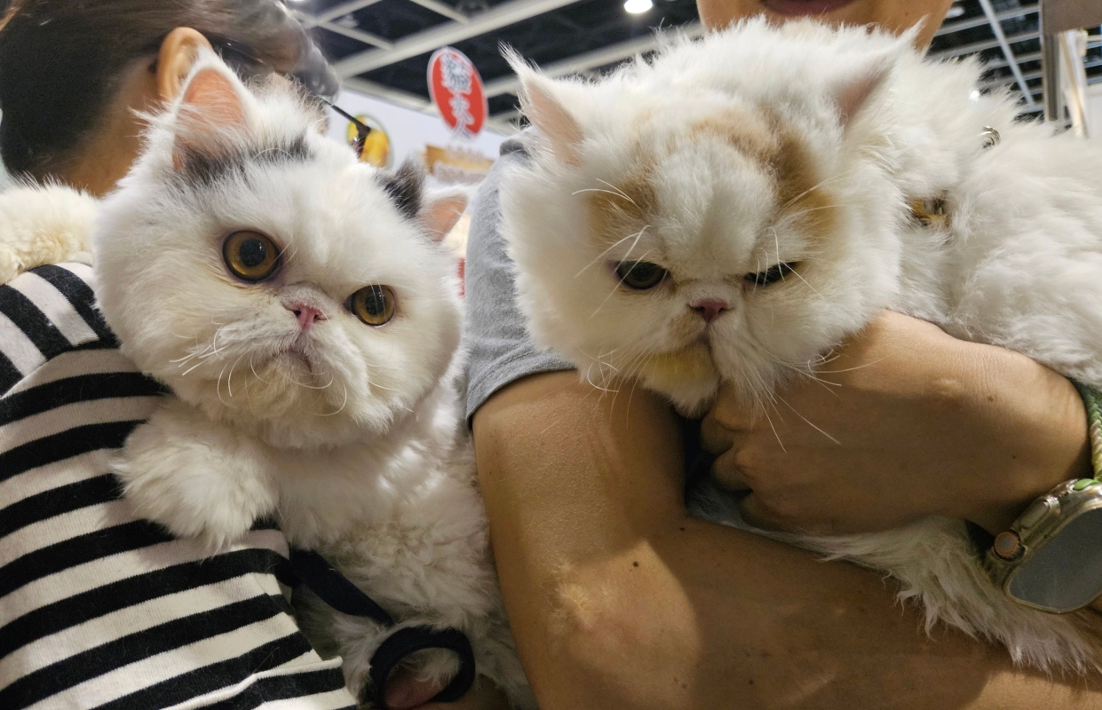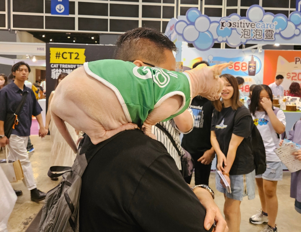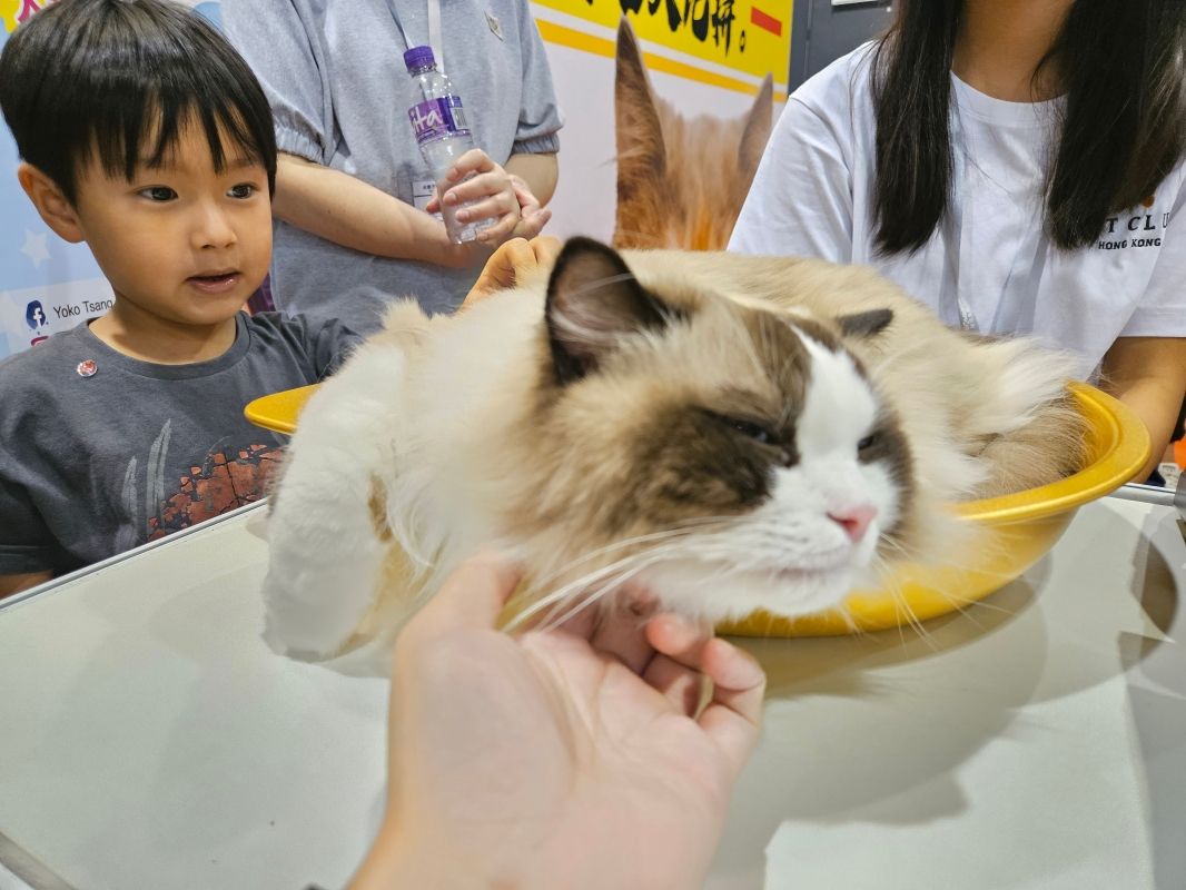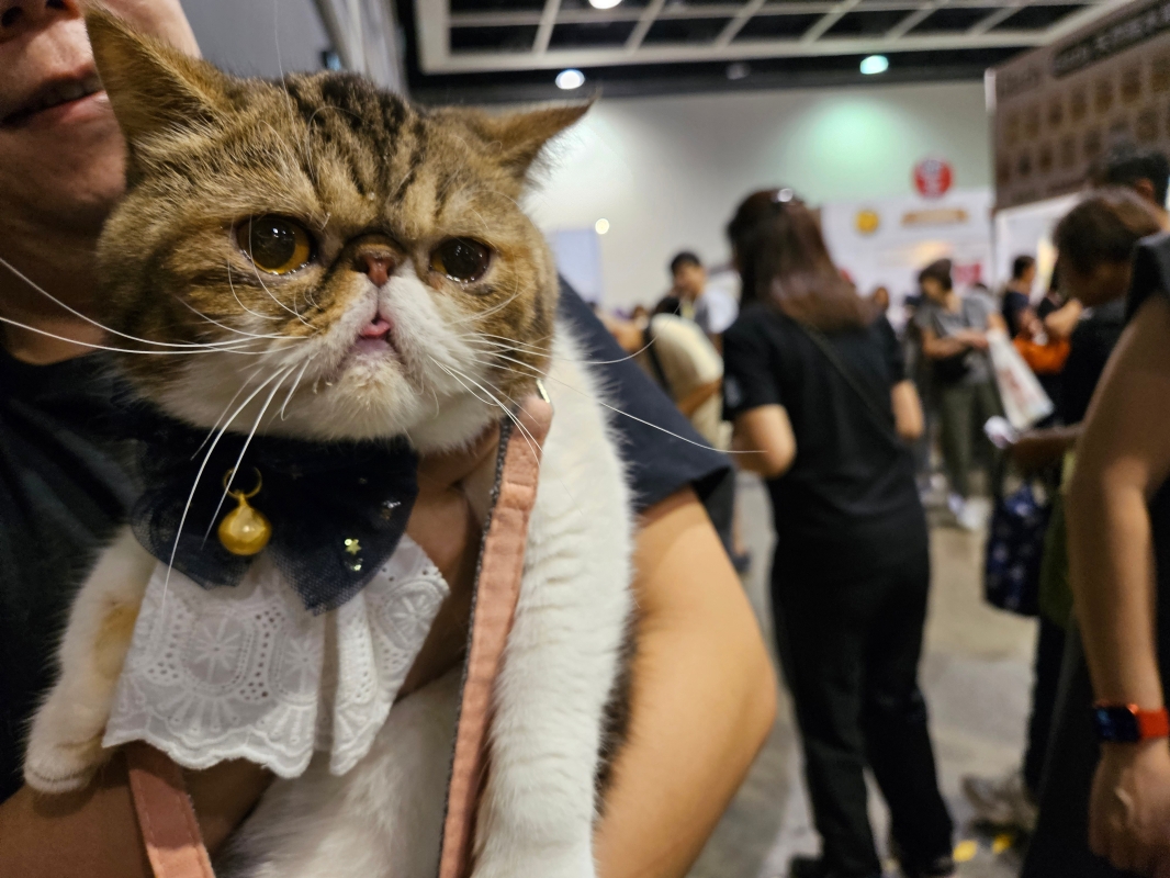 香港新聞網8月26日電(記者 黃璇) 一連3日的“香港貓迷博覽會2023”昨日(25日)起在灣仔會展舉行,是首屆以貓為主題的展覽會。今日星期六,現場人流擁擠,展覽攤位除提供一般貓糧,更有寵物攝影服務、保健產品、文創市集、保險計劃、衣物服飾等。有寵物移民公司表示,寵物移民和旅行近年趨普及,市民亦更願意投資在“心肝寶貝”身上。主辦方表示今次有逾130個參展商,估計整個活動入場多達15萬人次,是亞洲最大的貓咪主題博覽。至今日下午6時許,仍不斷有人排隊購票入場。 貓迷博覽會上,不少人抱着寵物貓一同逛展會(註:香港貓迷博覽會只接受貓隻進場,不可攜帶其他動物),吸引眾多遊人拍攝。牠們有些極其“社恐”,有些卻頗為“社牛”,不膽怯任人摸。一起跟隨香港新聞網的鏡頭來看看這些可愛的喵星人吧!