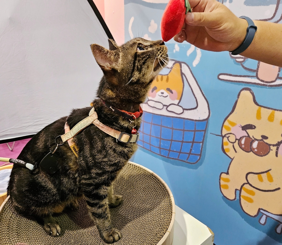 貓主人帶貓咪逛展會,吸引途人拍照。(香港中通社記者 黃璇攝)