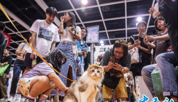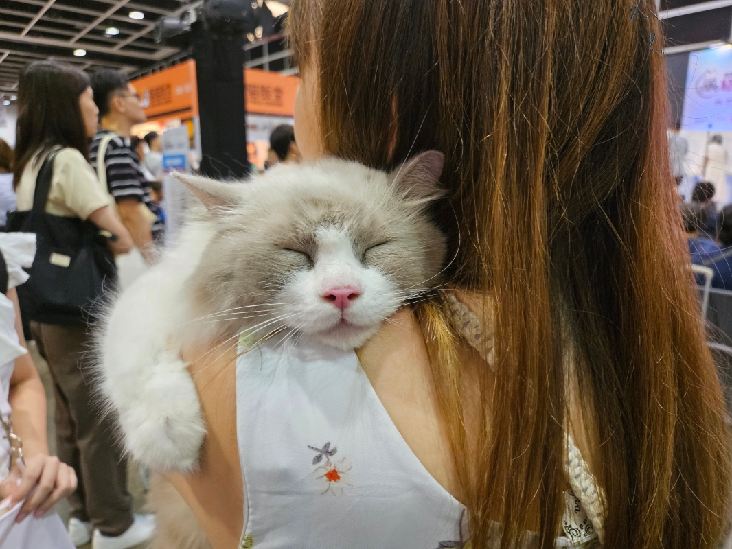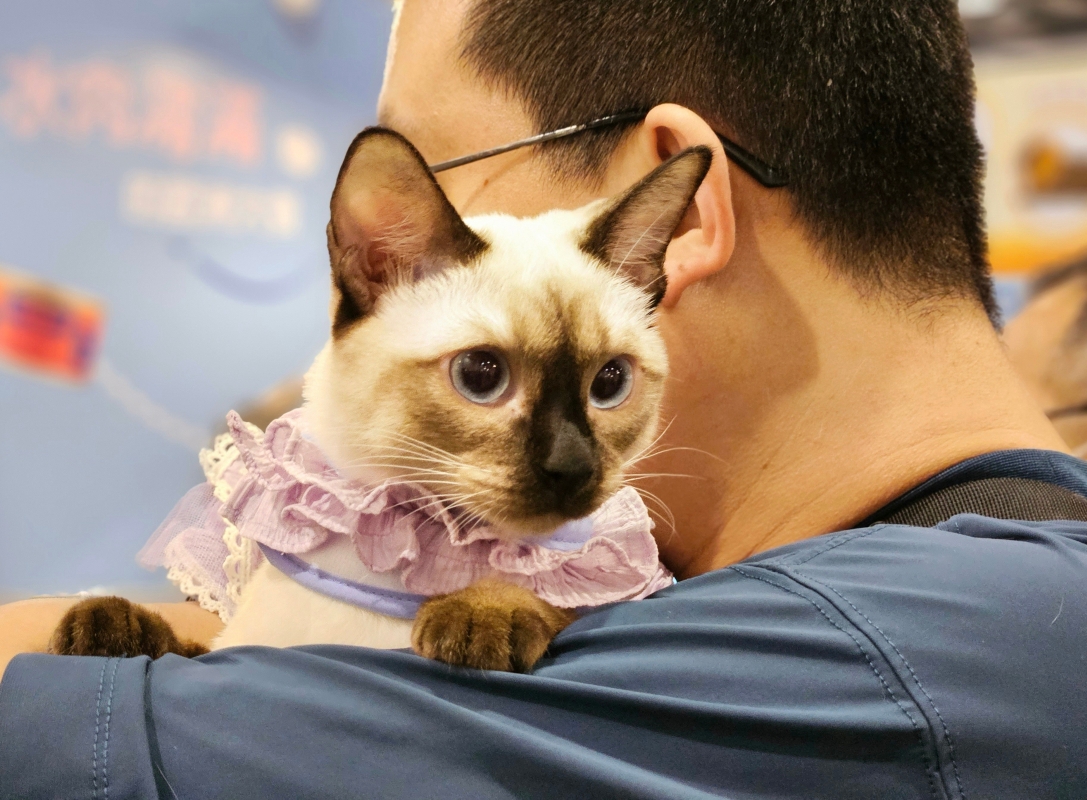 貓主人抱著貓咪逛展會,吸引途人拍照。(香港中通社記者 黃璇攝)