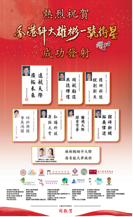 圖片來源:香港科技大學。圖為特區行政長官李家超等政府領導題寫賀詞及各慶賀單位 現場觀摩衛星發射儀式的葉志雄、葉吳彬彬伉儷激動地說:“很高興現場見證這一歷史時刻,我們夫婦這次資助香港科技大學衛星發射,是因為我們看到了香港科技大學積極推動香港航太科技發展的努力與決心,希望借此專案幫助熱愛航太事業的青年大學生更快地實現航太夢,培養出更多香港青年航太人才參與實際的太空項目,使香港更好的融入國家航太科技大計。這是我們夫婦作為中國人的責任,我們感到無尚的光榮和驕傲!”