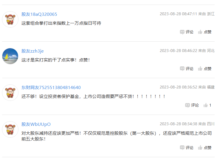 網友評論充滿了對股市的期待 在A股歷史上,印花稅已經調整了八次,其中最近兩次調整可以追溯到2008年。2008年9月19日,A股印花稅由雙邊征收改為單邊征收,當天暴漲9.45%,所有A股股票漲停。 據華福證券統計,1995年以來,漲跌幅方面,印花稅下調當日及5日、20日、60日、250日萬得全A漲跌幅平均值分別為4.5%、7.1%、7.4%、-0.5%、18.3%,上漲概率分別為100%、83%、83%、33%、67%。交易額方面,印花稅下調後的5日、20日、60日、250日、500日的日平均交易額分別較T-1日平均提高52%、53%、26%、58%、101%。 然而,在大盤受利好刺激大漲的時候,股市先揚後抑,高開低走,昨日北向資金依舊淨賣出82.47億元,這令投資者信心倍受打擊。 大股東停止減持能否再添利好 新政策經過一晚的發醇,又迎來新一波的大股東終止減持。 8月28日晚,中源家居、大智慧、金浦鈦業等13家上市公司發佈公告稱,根據證監會於8月27日發佈的監管要求,并結合自身情況,公司控股股東、實際控制人等大股東提前終止減持計劃。 值得注意的是,在已提出減持計劃且未完成的上市公司中,近百家公司觸發減持新規條款,這意味著未來可能還會有更多公司大股東提前終止減持計劃。 監管要求發佈僅一天,已有多家公司大股東積極響應減持新規,提前終止減持計劃。 8月28日晚,匯嘉時代公告,根據證監會於8月27日發佈的監管要求,結合公司具體情況,公司控股股東暨實際控制人潘錦海決定終止減持計劃。 據華夏基金篩選數據顯示,從上市公司角度測算,目前不符合減持條件的上市公司共計2139家。從市值上看,大於500億元的共有85只,100億元至500億元的共有406只,小於100億元的共有1648只。 中國證監會最新發佈的減持新規對上市公司大股東減持股份的影響立竿見影。而這一波終止減持潮是否能保證市場合理流動性,促進資本市場長期健康穩定發展? 專家對後市研判觀點不一 對於昨天股市走出一波先揚後抑的行情,有業內人士對記者表示,受外圍股市影響,市場情緒發生了轉變。週五,美聯儲主席鮑威爾在懷俄明州傑克遜霍爾發表了期待已久的講話,他在講話中強調,央行隨時準備在必要時繼續加息,這會大大降低投資者的投資意願;同時,國內經濟數據并不見好,投資者對資本市場仍處於觀望狀態暫不進場,導致參與交易量不大,也是一個原因。昨天上證成交額5172億,還沒有突破5月份的量。 銀河證券首席策略楊超指出,減半征收將直接降低投資者的交易成本,有利於鼓勵更多人參與證券交易,尤其是小型投資者。踴躍的投資者入市將帶來增量資金,資本市場活躍起來,有助於提升企業融資效率,為實體經濟提供更多資金支持,促進經濟的可持續增長。他表示,良性循環下,資本市場財富效應將逐步顯現,投資者對市場的信心隨之增強,也將吸引更多國內外投資者的關注和入,進一步擴大市場規模。 實際上,8月中旬以來造成市場連續調整主要因素之一就是資本的持續流出,放大了市場對經濟的擔憂情緒。一位不願透露姓名的市場人士分析,儘管此次政策對印花稅和融資融券保證金比例的調整有助於降低投資者交易成本,有利於促進市場成交規模,或只能在短期內起到提振市場情緒的效果。長遠來看,還是要經濟發展股市才能發展。 (完) 【編輯:錢林霞】
