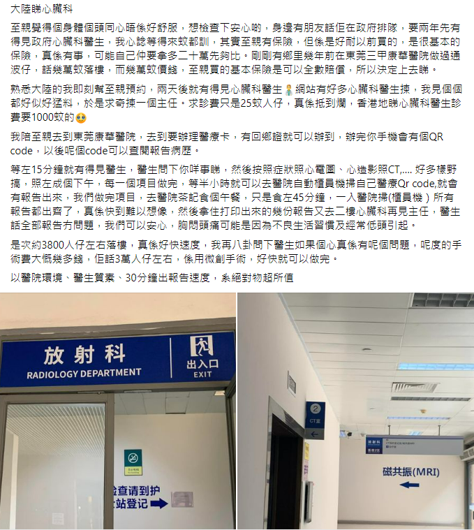 港女分享東莞求醫經歷,大讚服務平靚正! 香港公院專科向來因輪候期長且昂貴而為人詬病,有市民就想到解決辦法,體驗“北上睇醫生”。 樓主在Facebook“深圳大灣區吃喝玩樂開心分享區”發文,分享“北上睇醫生”的經驗。她表示,至親近來頭痛兼心臟不適,想去專科檢查。無奈香港公院專科排期需要2年,才有得見醫生;而且專科治療收費高昂,至親雖有買保險,但預計仍要自費20萬。 她想到曾有鄉里在“東莞三甲康華醫院”做過“通波仔”,收費只需幾萬元,且保險全賠,令樓主非常心動。她決定帶至親到該醫院求醫,並立即做預約,2日後即有位。她更發現診金低廉得超乎想像:求診費只是25元人民幣,香港看心臟科醫生診費要1000元港幣。 樓主詳細介紹求醫經過,等待約15分鐘後即見到醫生,醫生按症狀安排照心電圖、心造影照CT等,每個項目做完,等半小時就可以去醫院自動櫃員機,掃描自己的醫療QR code領取報告;所有項目報告只需45分鐘就出齊,令樓主感嘆“快到難以想像”。 最後,她們領報告再會面心臟科主任,得到診斷為一切正常,至親的胸悶頭痛,可能是因為不良生活習慣及經常低頭引起,讓她們可以安心。就算要做手術,也是可以快速完成的微創手術,費用約3萬元人民幣。 樓主統計,這次求醫所有費用加起來僅約¥3800人民幣,高效服務亦令她非常滿意,大讚醫院環境、醫生質素、出報告速度,絕對物超所值! 樓主的分享引來網民熱烈討論,不少人紛紛表達對本港醫療體系的不滿,直言“香港等睇醫生真係好慘”,既付不起私家醫院費用又等不及公院,日後就唯有去內地北上求醫。 (完) 【編輯:王軼南】