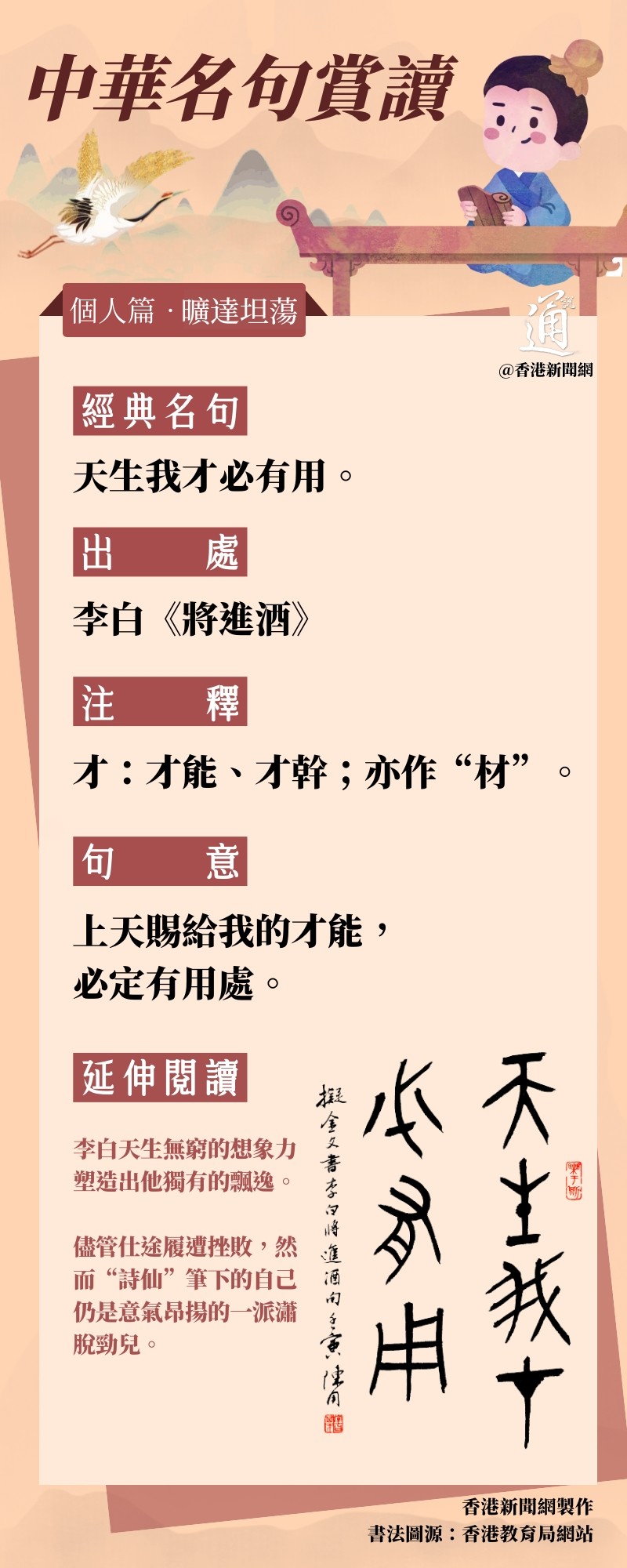 香港新聞網9月14日電 “天生我材必有用,千金散盡還復來”源於李白所作的《將進酒》:“人生得意須盡歡,莫使金樽空對月,天生我材必有用,千金散盡還復來,烹羊宰牛且為樂,會須一飲三百杯。” 而這兩句的意思是:上天給了我才能必然能得到應用;即使散去千金,花完了還會重新得到。李白作這首詩,大約是天寶十一年,當時李白已被唐玄宗貶官達八年,這期間李白經常跟朋友到處遊山玩水,部分詩作顯露出他懷才不遇的慨歎。李白深信自己擁有滿腹才華,但卻得不到賞識,因此有“天生我才必有用”的豪氣,亦深信“千金散盡”,必可“復來”的信心。 為加強中國文學和文言經典的學習,香港特區政府教育局繼續開展“中華經典名句推廣活動”,從《致知達德》(中華傳統美德語文學習資源)中選取40則名句,作為本學年推廣的內容。香港新聞網因此推出“中華名句賞讀”系列。