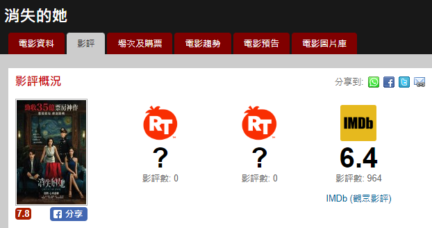 《消失的她》蟬聯香港票房日榜亞軍 網友讚“內地片進步神速”!分享到: