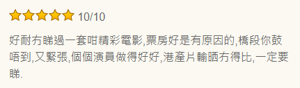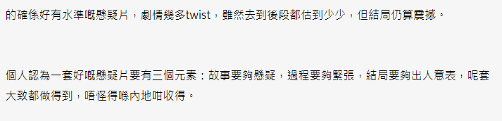 (WMOOV網站截圖) “好久沒看過一套這麼精彩的電影,”有香港網友表示,該片橋段令人猜不到,演員的表演也很好,“港產片輸了,沒得比”。其他網友亦感嘆,內地片近年進步神速。 值得注意的是,在香港討論區,《消失的她》亦正掀起熱議。 有香港網友就曬出電影票,“埋怨”“好多人看,沒(好的)位置揀”;也有力薦該片的網友稱,早前電影在內地上映的時候,就已經去深圳看過兩次,形容內地近期“好戲一套接一套。消失的她、八角籠中、孤注一擲......” “個人認為一套好的懸疑片要有三個元素:故事要够懸疑、過程要够緊張、結局要够出人意表。”還有影迷分析說,《消失的她》大致都做到了,怪不得在內地大賣!