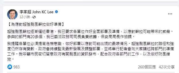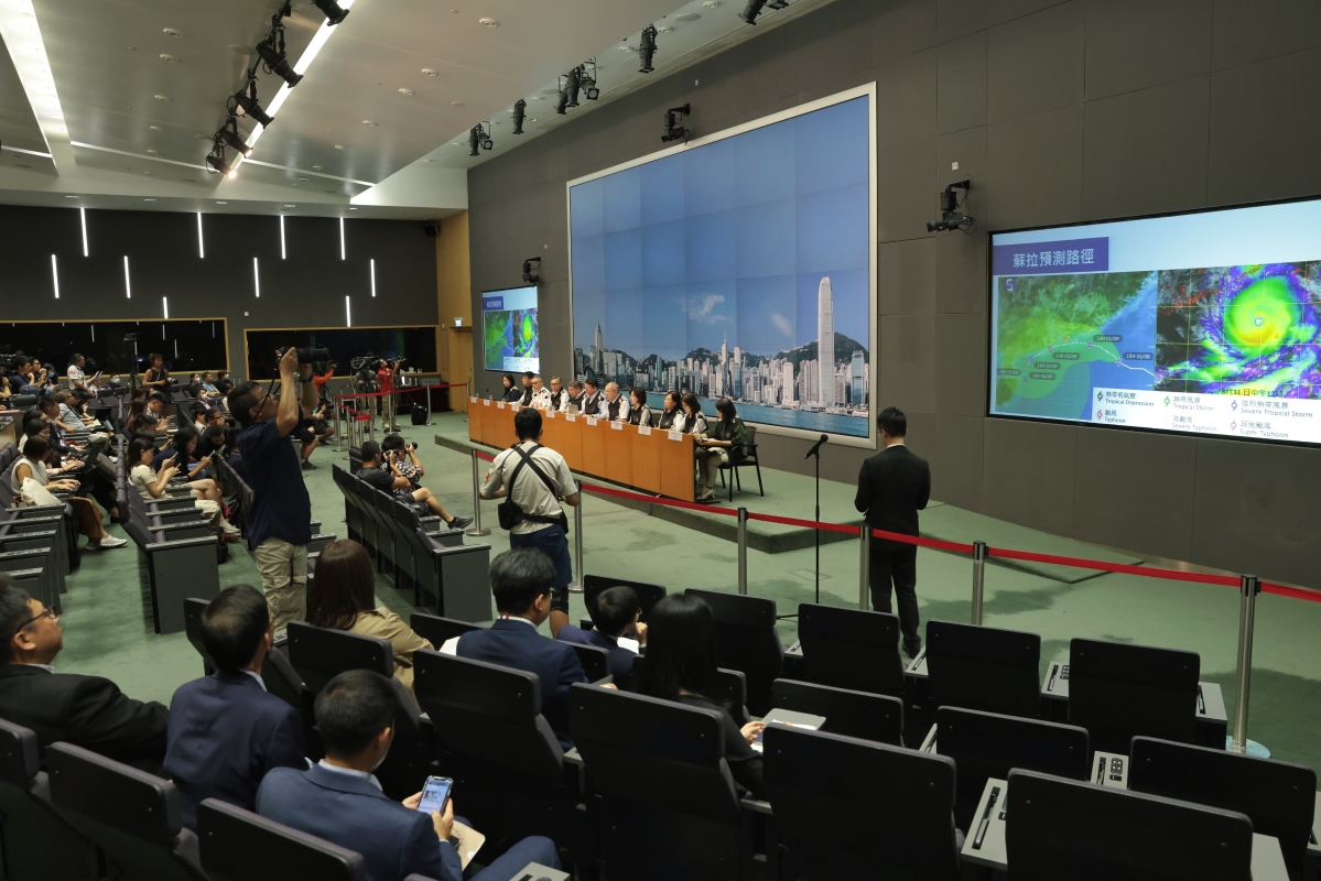 聞風將至,特首李家超今早在社交媒體發文,向大眾講解政府的部署。主要是: ●已要求各單位作好全面部署及準備,以應對“蘇拉”可能帶來的威脅。 ●參與的部門有20多個,已委派政務司司長負責統籌,保安局局長作協調。 ●提醒各單位必須提高危機意識,做好部署以應對可能出現的最壞情況。 當日上午,特區政府已召開跨部門的督導委員會會議,做好部署。下午,政務司司長陳國基會聯同相關部門代表舉行聯合記者會,交代政府應對颱風的工作。 天文台台長陳栢緯表示,目前“蘇拉”是超強颱風,根據預測路徑,“蘇拉”最接近香港的時間,在9月1日晚上到9月2日的早上,“蘇拉”會在接近香港的位置掠過到西邊,屆時減弱為颱風。離岸及高地風力可能達到飓風程度,如屆時出現有關情況,或需發出十號飓風信號,但要視乎強度變化。