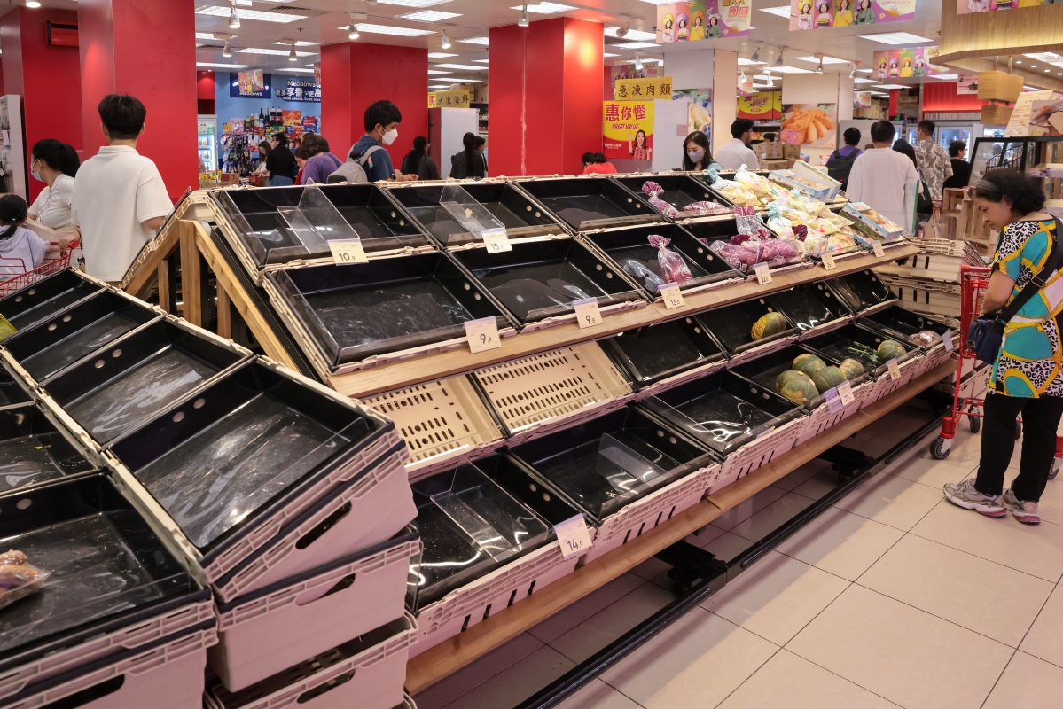 香港中通社記者 謝光磊 攝 香港中通社記者傍晚在市區看到,市民到超市提前購買未來兩天的食物,蔬菜銷量暴漲;商場店鋪的玻璃門窗均貼上膠布,工作人員在門口堆沙包以防水浸。 “蘇拉”將至,香港早有準備。 【編輯:黎金良】