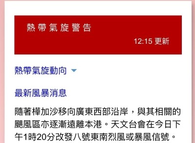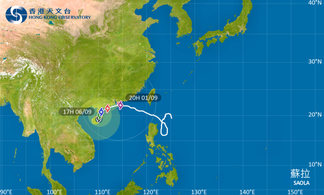 天文台圖片。 在晚上8時,“蘇拉”集結在香港天文台之東南約60公里,即在北緯22.0度,東經114.6度附近,預料向西或西北偏西移動,時速約12公里,橫過珠江口一帶。 數小時內在香港天文台以南40公里左右掠過 天文台表示,“蘇拉”的眼壁現正橫過本港,對本港構成相當大的威脅。本港東部地區正吹颶風。按照現時預測路徑,“蘇拉”會在未來數小時於香港天文台以南約40公里左右掠過,預料十號颶風信號會維持一段時間。本港將由吹偏北風逐漸轉為吹東至東南風,原來受遮蔽的地方可能會變得當風。市民需保持高度警覺。天文台提醒市民不要離開有屏蔽的地方並留意其破壞性的風力。 天文台表示,香港今天吹強風至烈風程度北至西北風,黃昏風勢進一步增強,離岸及高地達颶風。大致多雲,間中有狂風驟雨及雷暴,雨勢有時頗大。海有巨浪及湧浪。明日風勢頗大,有狂風大驟雨,海有巨浪及湧浪。星期日驟雨減少。隨後兩三日短暫時間有陽光,亦有幾陣驟雨。 吐露港最高水位或達歷史紀錄 受風暴潮影響,沿岸低窪地區的水位今晚起將急速上升。晚上約9時開始,本港東部沿海地區水位會上升,當中吐露港的最高水位預計於接近午夜升至海圖基準面以上約6米左右,比正常潮位增加約4米,最高水位可能達歷史紀錄。威脅最大的地區包括沙田、大埔、沙頭角、西貢等,會出現嚴重水浸,部分地區水浸深度或超過1米。 本港各沿岸地區的水位亦會於明日(9月2日)早上約六時開始顯著上升,維多利亞港的最高水位將升至海圖基準面以上約3米多。沿岸低窪地區如鯉魚門,比正常潮位增加約1.5米,而大澳水位則會升至海圖基準面以上約3.5米,比正常潮位增加接近2米。海面有極巨浪及湧浪,市民應遠離岸邊,切勿進行水上活動。