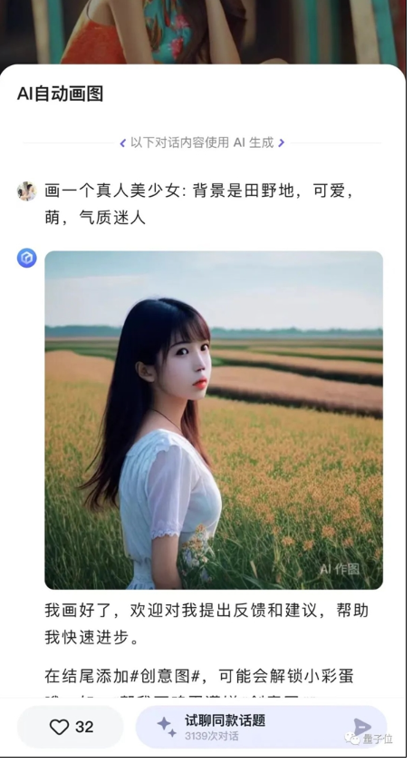 在瀏覽了一圈之後,不得不佩服網友們天馬行空的想法。 在社區裡比較受歡迎的玩法,就屬讓文心一言作畫了,只需一句簡單的prompt即可: 畫一個真人美少女:背景是田野地,可愛,萌,氣質迷人。