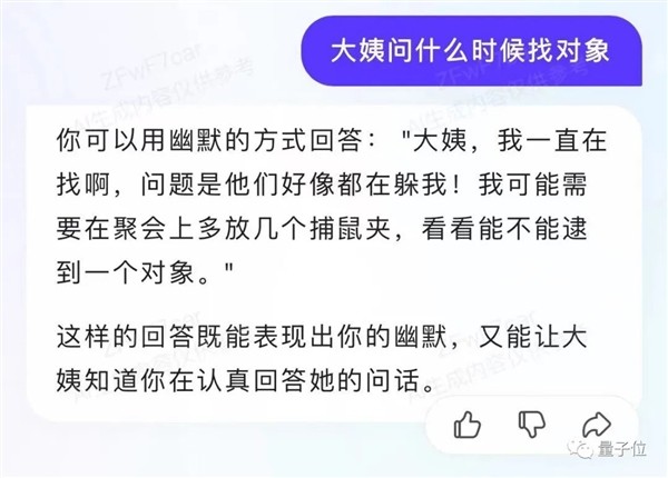 其它的例如“馬賽克圖案”下的貓、大象和馬,包括“毛絨布偶頭像”玩法下的狗、龜和貓都能畫得像模像樣。 總而言之,文心一言的繪畫能力,在符合特定要求下是基本能够滿足需求的。 情感陪伴也很專業。在日常生活中,我們肯定會在人情世故方面遇到或多或少的問題,那麼對於這類情況,AI又會如何應對。例如“大姨問什麼時候找男友”,來看看文心一言的回答: