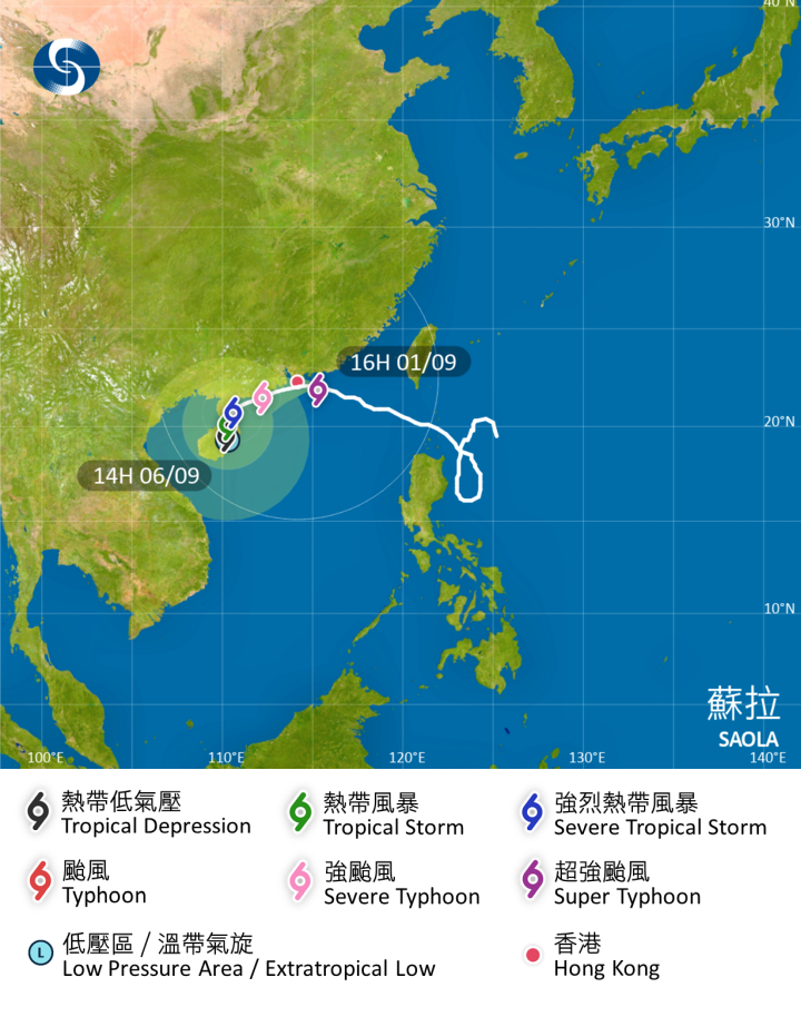 中通社圖片。 在下午5時,“蘇拉”集結在香港之東南偏東約110公里,即在北緯21.9度,東經115.1度附近,預料向西北偏西移動,時速約10公里,移向珠江口一帶。蘇拉繼續以超強颱風強度逼近本港,本港離岸及高地吹烈風,部分高地達暴風程度。與“蘇拉”相關的狂風大驟雨正影響本港。 林超英在社交平台上傳颱風位置圖,並對比中午及早上“蘇拉”的移動路徑,指“你看到颱風的移動趨勢嗎?作最壞打算,做最好準備”。根據圖片可見,“蘇拉”更趨貼近本港。