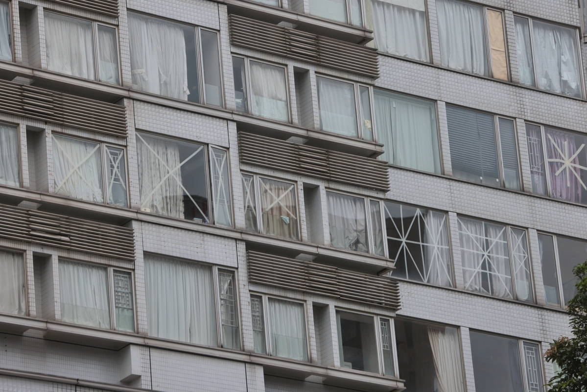 香港中通社記者 謝光磊 攝 市民在家中窗戶貼上膠帶防風。