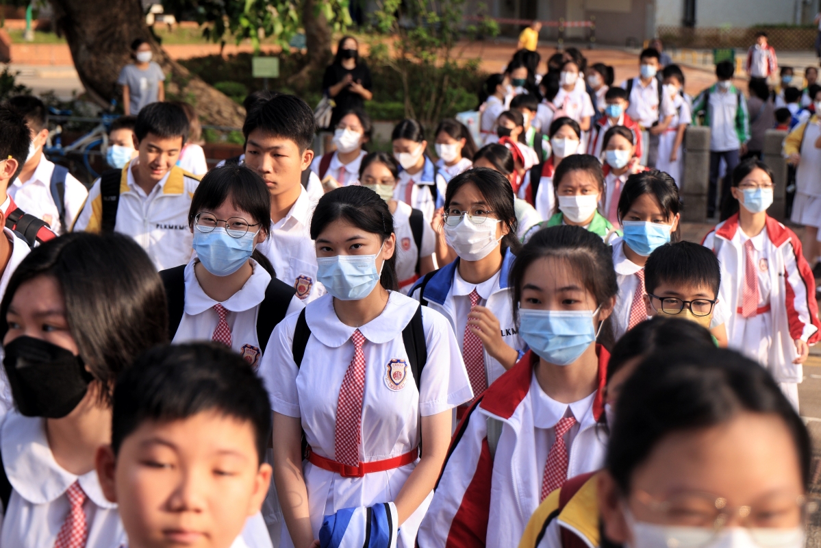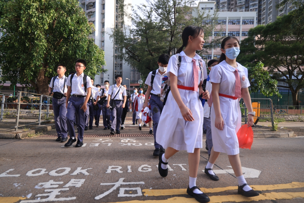 全港中小學及幼稚園順延至今天開學。(香港中通社記者 許其皓攝) 朱偉林續說,不少學生都期待回校,當中有兩成為跨境學生,校方已經事先提醒學生準時上車,亦有提醒保母車公司向家長確認上車地點及時間等,最終所有學生今天順利返校。 而教育局長蔡若蓮今早探訪保良局馬錦明中學,了解開學日的情況。她事後會見傳媒時表示,得知風暴期間有學校窗戶被吹爛、禮堂出現水浸,不過學校均在短時間內處理好,對此感謝學校的努力。