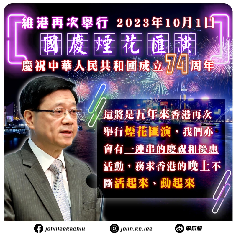 李家超FB圖片。 在國慶日舉行國慶煙花匯演,是香港回歸後歷年必定舉辦的慶典之一。特區政府過去曾四度取消國慶煙花匯演,包括2013年“南丫島海難”事件一周年、2014年非法“佔中”、2019年“修例風波”及2020年新冠肺炎疫情。(完) 【編輯:孟宜君】