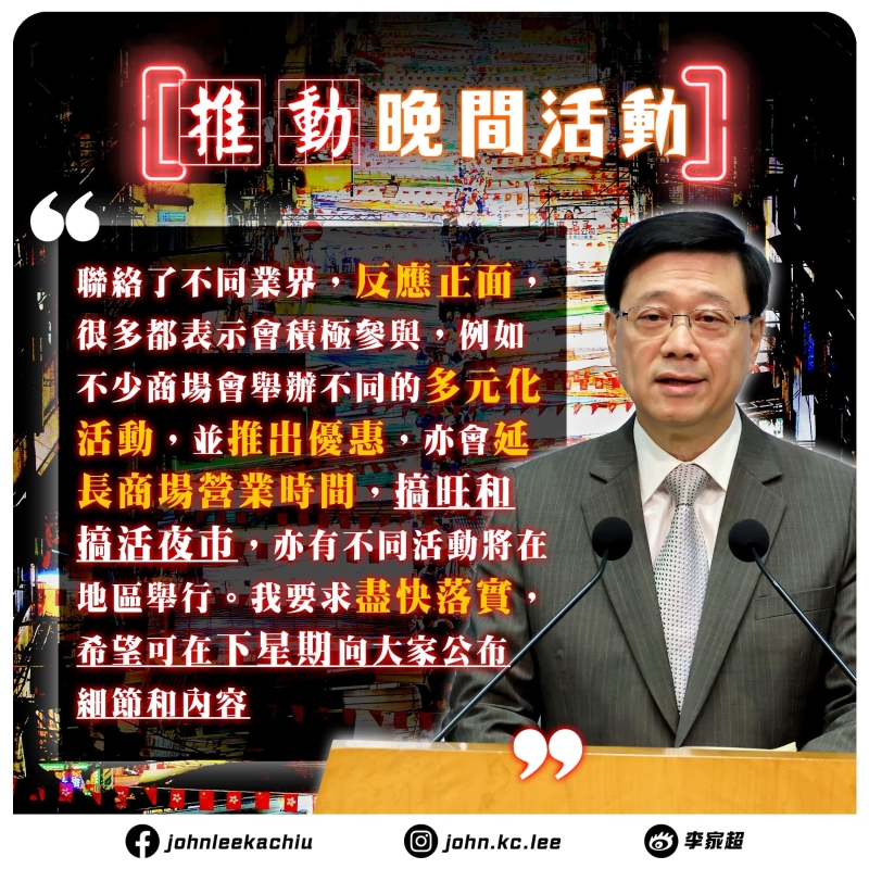 李家超FB圖片。 另外,李家超提及推動夜經濟時表示,當局目前正在籌備當中,業界反應正面,很多均表示會積極參與。不少商場會舉辦不同的多元化活動及優惠,亦會延長營業時間,以“搞旺”、“搞活”夜市。他已經要求要盡快落實各項活動等,希望能在下周公布詳情。