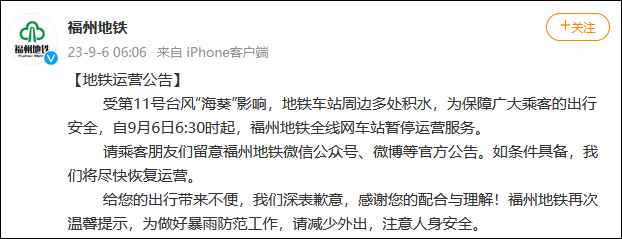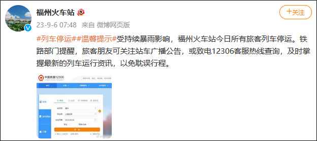 另據微信公眾號“東南網”消息,受暴雨影響,福州市區道路多處積水,無法正常通行,為保障廣大乘客的出行安全,自9月6日06時30分起,福州市區公交線路臨時停運,具體恢復時間將結合道路通行情況另行通知。 @福州火車站 6日發佈提示稱,受持續暴雨影響,福州火車站今日所有旅客列車停運。鐵路部門提醒,旅客朋友可關注站車廣播公告,或致電12306客服熱線查詢,及時掌握最新的列車運行資訊,以免耽誤行程。