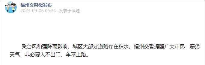 微信公眾號“福州交警微發佈”9月6日發佈消息稱,受颱風和強降雨影響,城區大部分道路存在積水。福州交警提醒廣大市民:惡劣天氣,非必要人不出門,車不上路。