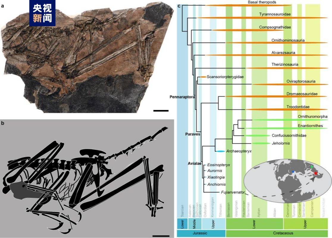 圖源:央視新聞 中國科學院古脊椎動物與古人類研究所研究員王敏介紹,“奇異福建龍屬於一類生活在侏羅紀晚期的叫做‘鳥翼類’的恐龍,目前為止,全世界在整個侏羅紀發現鳥翼類恐龍化石非常稀少,只有三個地點有這樣的保存,一個是在中國遼西或者河北地區的燕遼生物群,另一個在德國的索倫霍芬,奇異福建龍就代表了第三個。通過對整個侏羅紀全球古地理的複原,發現奇異福建龍代表了生活的緯度最南的恐龍化石記錄”。 據介紹,鳥翼類是由恐龍演化到鳥類過程中的一個過渡物種,中國早期發現最早的鳥翼類是在“燕遼生物群”,大概距今1.6億年,之後,“熱河生物群”發現最早的原始鳥類化石是在距今1.3億年左右,兩者演化過程中大概有3000萬年的空白。福建省地質調查研究院高級工程師徐立明表示,經過研究確定奇異福建龍為距今1.48億年到1.5億年之間,因此奇異福建龍的發現彌補了鳥類起源在時間和空間上的部分空白,為研究鳥類起源與演化提供了重要信息。 除了奇異福建龍外,考察團隊還發現了與奇異福建龍同時期的大量保存完好的爬行動物化石,包括水生/半水生的龜鱉類、離龍類,研究人員將其命名為“政和動物群”,這也是目前全球已知侏羅紀最晚期,地理位置最南的保存有鳥翼類的動物群。 (完) 【編輯:錢林霞】