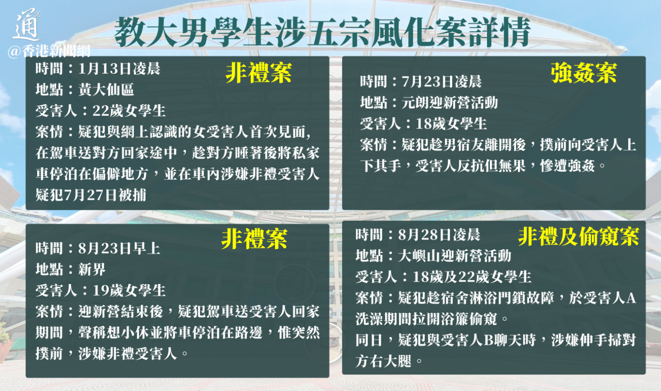 警方交代案情。警方臉書影片截圖 警方表示,高度重視有關案件,已經主動與校方溝通。警方又呼籲任何人曾經在本年7月至8月期間,參加元朗區、大埔區及大嶼山南區迎新營期間懷疑被性侵過,應盡快與警方聯絡。 校方:若查明屬實 將啟動懲處程序 對此,香港教育大學表示,案件已進入刑事調查階段,校方不宜作出具體評論,但強調大學不是法外之地,所有大學持份者必須守法。校方不會容忍任何違法行為,若查明屬實,將啟動懲處程序,絕不姑息。 這次的風化案涉及到香港的兩所大學:香港大學,香港教育大學。 而疑犯就只有兩人,分別是20歲姓鄧的香港大學男學生,以及28歲姓嚴的香港教育大學男學生。其中,姓嚴的教大男學生,一個人就已經犯下4宗案件。 香港教育局就指出,非常關注近日涉及大學迎新營活動的個案,強調對學生違法違紀及欺凌行為“零容忍”。由於個案進入司法程序,教育局不便評論,但已經明確要求相關大學嚴肅處理迎新營活動的學生投訴,並配合執法機構的調查。若發現投訴屬實,大學必定按機制採取紀律行動,嚴重者可被開除學籍。 發言人又重申,社會各界對大學生的行為和操守有所期望,大學生必須遵紀守法,持守正面價值觀、實踐良好品德行為,自尊、自愛、自強,成為德才兼備,具個人素養的良好公民。大學亦應加強培養學生品德的工作,並確保迎新營活動在合法、安全及參與者互相尊重的前提下進行。