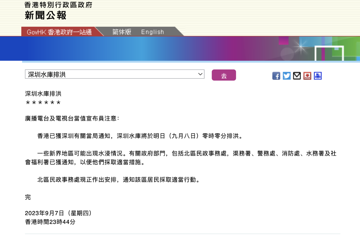 香港新聞網9月7日電 據香港特區政府新聞公報7日晚間消息,香港已獲深圳有關當局通知,深圳水庫將於9月8日零時零分排洪。