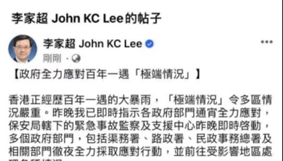 網圖。 至今早約5時半,港府頒布暴雨下的“極端情況”安排,並在今早近11時表示預料“極端情況”至少維持至傍晚6時。港府表示,香港出現廣泛地區水浸,公共交通嚴重受阻,山泥傾瀉風險極高。再次呼籲市民在惡劣天氣期間應留在室內以保障自身安全,遠離低窪地區,並提醒僱主,除必要人員外,不應要求僱員返回工作地點上班。政府會繼續密切審視最新天氣、道路及公共交通服務情況,並在下午3時公布下一步安排。