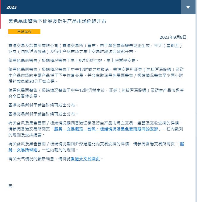香港新聞網9月8日電 香港交易所9月8日早間宣布,由於黑色暴雨警告現正生效,今天(星期五)證券(包括滬深股通)及衍生產品市場之早上交易時段均會延遲開市。
