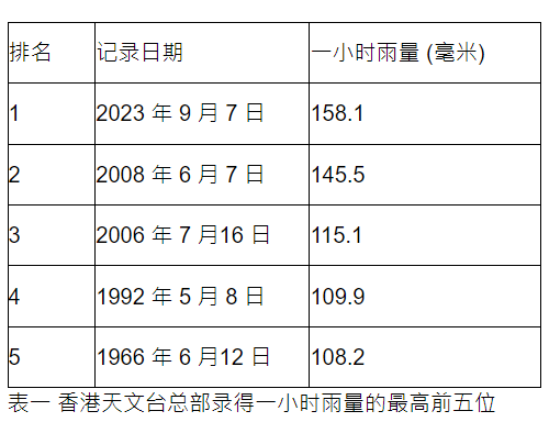 香港天文台總部的一小時降雨量最高前五位(圖片來源:香港天文台)