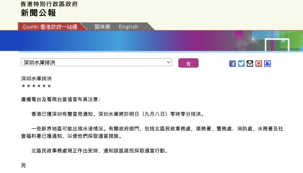 香港中通社9月8日電(記者 張明臻)熱帶風暴“海葵”殘餘低壓槽7日晚間至8日,給深圳和香港帶來暴雨及水浸。8日下午,香港特區政府多名官員於政府極端情況安排記者會表明,多區出現水浸情況,與深圳排洪沒有直接關係。 香港特區政府7日夜間發布消息,深圳於8日零時零分開始排洪。 保安局局長鄧炳強在記者會上指出,根據現有機制,深圳當局會在考慮深圳水庫排洪前向香港發出預警,並且盡可能在3小時前發出通知。但今次雨勢很急,可預測性很低,香港警務處在深圳排洪前45鐘接獲通知。警務處接獲通知後,隨即通知相關部門及市民,採取適當的戒備及撤離措施。