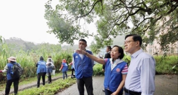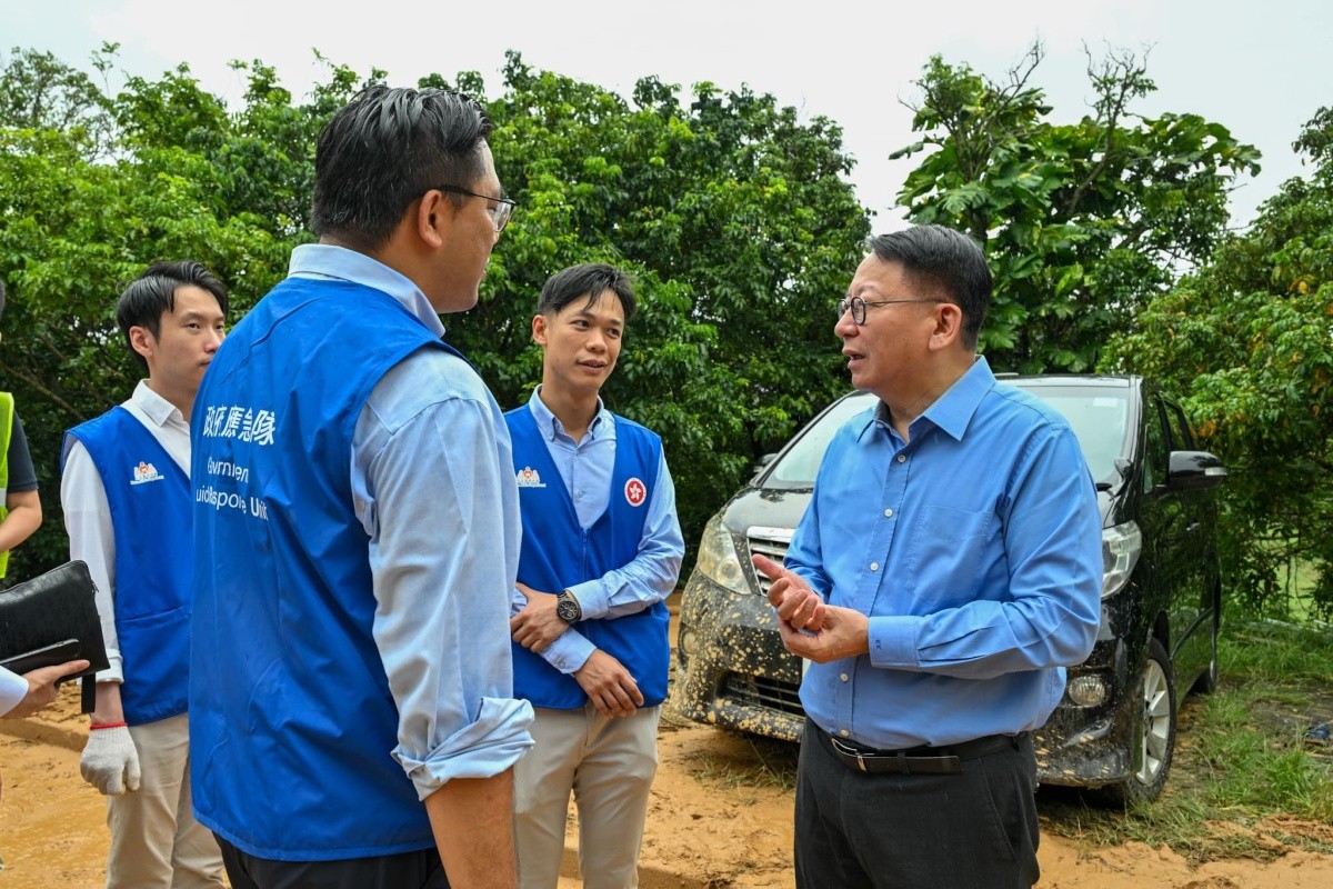 (廉署9日調派一批職員加入“政府應急隊” 圖源:廉署Facebook) 亦有政府人員到北區羅湖道,協助清理路上水窪和泥濘。政務司司長陳國基和民青局副局長梁宏正到場視察,為公務員打氣。 陳國基指,打鼓嶺羅湖村受暴雨影響,部分地方出現水浸和山泥傾瀉,政府人員、村民和義工等已開通相關道路,希望此次動員能加快餘下善後工作,讓村民早日恢復正常生活。 陳國基稱,此次暴雨百年一遇,來得很急很大,政府上下由應急、救援到善後,沒有半點鬆懈,一直全力應對。他再次感謝所有在極端天氣下緊守崗位的政策局和部門同事,發揮專業高效的精神,致力維持緊急服務和應對突發事故,將暴雨和水災為香港帶來的破壞和影響減至最低,守護好香港這個共同家園。