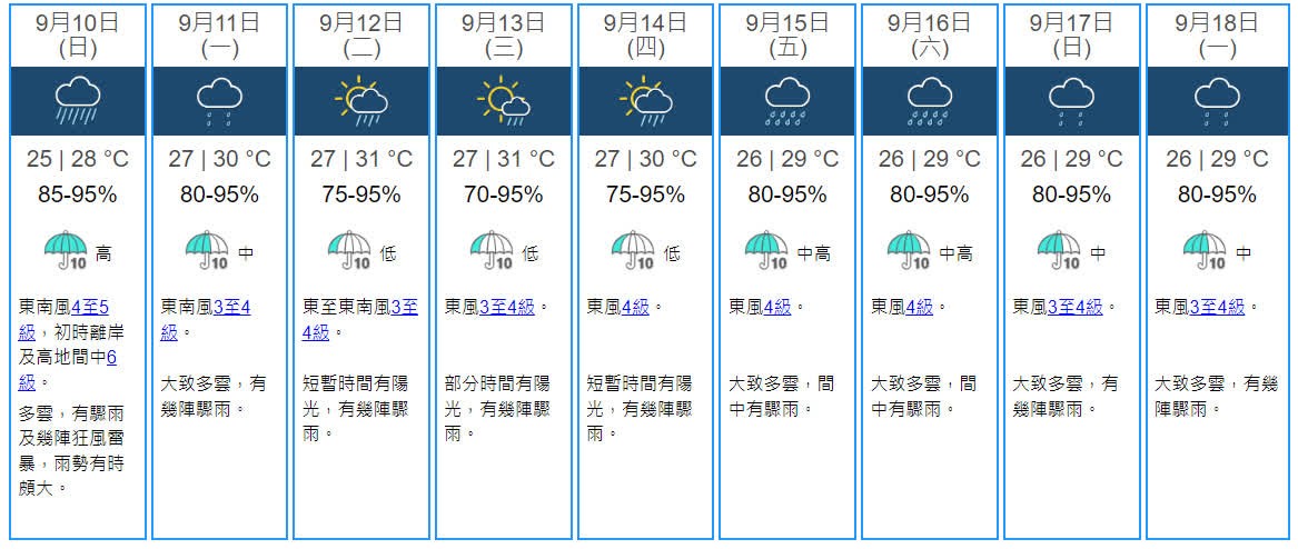 香港天文台10日凌晨4時發出特別天氣提示,本港以南的一道雨帶正逐漸靠近沿岸地區。圖自香港天文台 今日有幾陣狂風雷暴,雨勢有時頗大 香港天文台在10日凌晨0時20分更新九天天氣預報,指一道低壓槽會在今日繼續為廣東沿岸帶來大驟雨及雷暴,料吹東至東南風4級,初時離岸間中5級,多雲,有驟雨及幾陣狂風雷暴,雨勢有時頗大。預料在今天(10日)中午前後影響珠江口一帶,市民應提高警惕。 香港天文台料隨著該低壓槽減弱,本周初至中期驟雨減少,天色稍為好轉;不過預料一道廣闊低壓槽會在本周後期為華南沿岸地區帶來不穩定天氣。