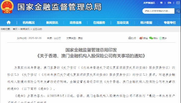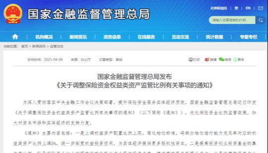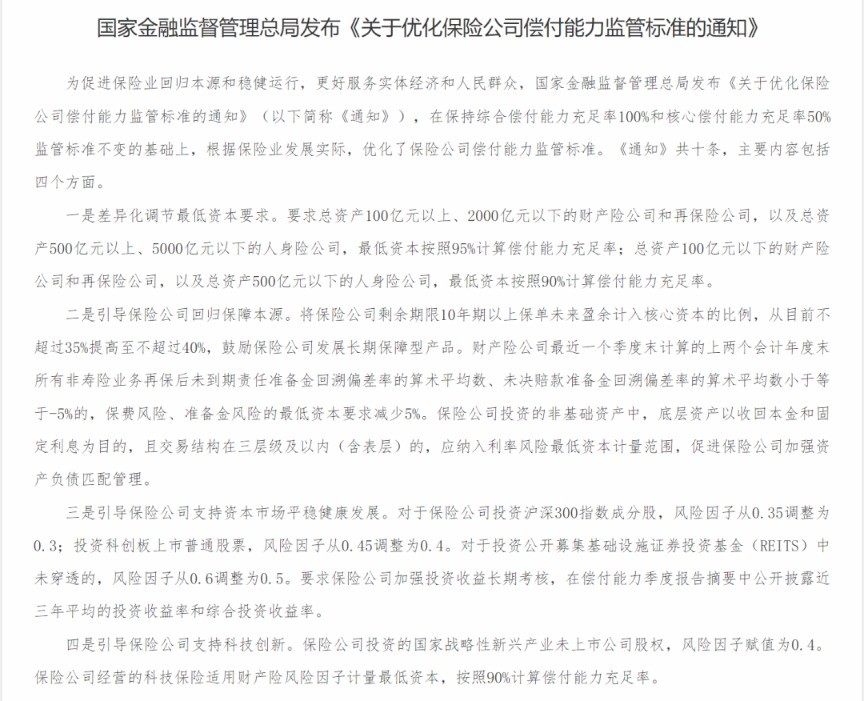 重磅利好 金融監管總局發文擴大險資入市香港新聞網9月11日電 國家金融監督管理總局(下稱“金融監管總局”)昨(9月10日)發佈《關於優化公司償付能力監管標準的通知》(下稱《通知》)。重點對保險公司的風險因子進行了調整。業內人士分析,風險因子的降低意味著保險公司的資本佔用將更少,可支配的資金運用空間也就更大,也就是說,增量險資入市空間將進一步被打開。