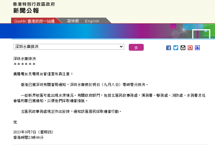 深圳市低窪地區出現嚴重水浸。 而深圳方面,降雨量亦打破1952年有氣象紀錄以來7項歷史極值,全市低窪地區嚴重水浸,深圳亦因此決定排洪。 香港特區政府7日晚上11時44分發出新聞稿,指已經獲深圳有關當局通知,深圳水庫將於9月8日零時零分排洪。然而公告一出,一眾”黃絲”又跳出來“攻擊”,不但嘲諷是“祖國送大禮”,更抹黑香港水浸全因深圳排洪。
