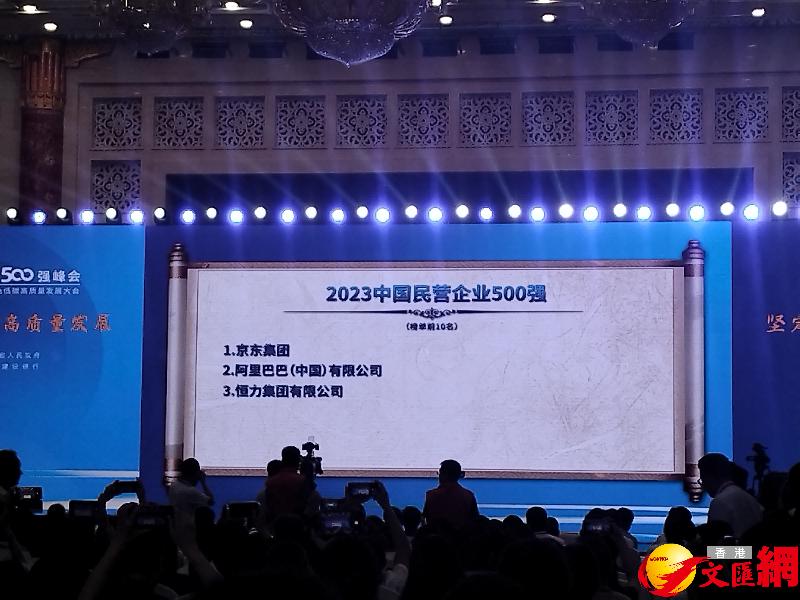 2023中國民企500強發布,京東蟬聯榜首。圖為發布現場。香港文匯網記者 馬曉芳 攝 今年是全國工商聯連續組織開展的第25次上規模民營企業調研,共有8961家年營業收入5億元以上的企業參加。 據《2023中國民營企業500強調研分析報告》(以下簡稱“報告”)數據,民營企業500強入圍門檻達275.78億元,比上年增加12.11億元;製造業民營企業500強入圍門檻達145.16億元,比上年增加19.44億元;服務業民營企業100強入圍門檻達314.04億元,比上年增加12.89億元。有17家500強企業營業收入超3000億元,其中有8家企業營業收入超過5000億元。營業收入前20家中,前三名排序與上一屆相同,依次為京東集團(2022年營業收入10462.36億元)、阿里巴巴(中國)有限公司、恒力集團有限公司。營業收入前20名中福建企業寧德時代新能源科技股份有限公司成績亮眼,排名從2021年第61名躍升至2022年第16名,營業收入從2021年1303.56億元增至2022年的3285.94億元;比亞迪股份有限公司則從第2021年第26名上升至第10名。 民營企業500強的營業收入總額39.83萬億元,增長3.94%。資產總額46.31萬億元,增長11.21%。稅後凈利潤1.64萬億元,下降4.86%。第二產業入圍企業359家,較上年增加17家,營業收入總額佔比較上年增加4.48個百分點、資產總額佔比較上年增加0.62個百分點。製造業企業322家,繼續保持主導地位。民營企業500強前十大行業共包含303家企業,黑色金屬冶煉和壓延加工業、電氣機械和器材製造業、批發業位居前列。 【編輯:丘志彬】