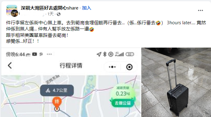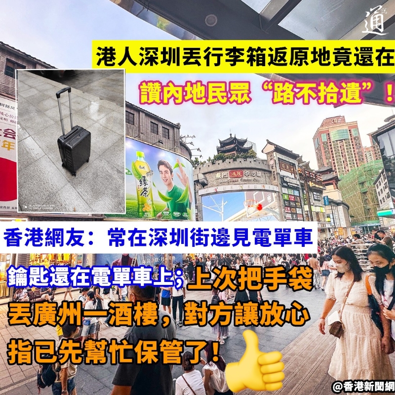 香港新聞網9月12日電 香港與內地今年2月6日恢復全面通關後,港人不時“北上”深圳消費。近日,有香港網友就在臉書 “深圳大灣區好去處開心share” 群組中發帖,形容把行李箱遺忘在深圳一條街中心後,吃完飯、約3個小時後返回原地查詢,沒想到行李箱還在原地...... “行李留在街中心沒上車,去笋崗吃個飯再過去(找行李)。”該香港網友表示,3個小時過去了,行李箱不僅還在原地,更有人幫忙把行李箱放到了路的一邊。 網友驚喜之餘,隨即租了一輛共享單車,帶上失而復得的行李箱再去笋崗,直言“感覺好正(好棒)!”
