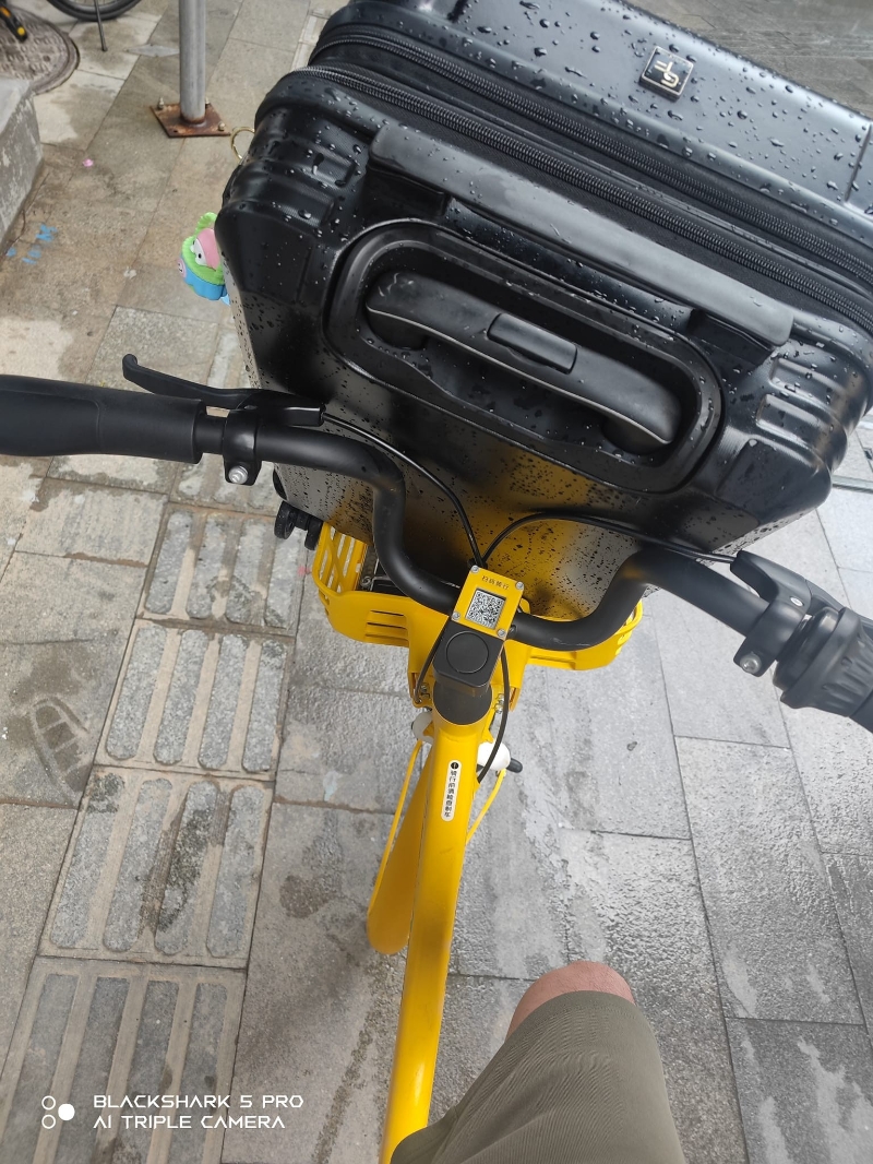 (網絡圖片) 從網友上傳的照片可見,其把黑色的小型行李箱放在了共享單車的車籃裡;4.7公里的距離,租共享單車的費用亦僅花費其3.5元人民幣。