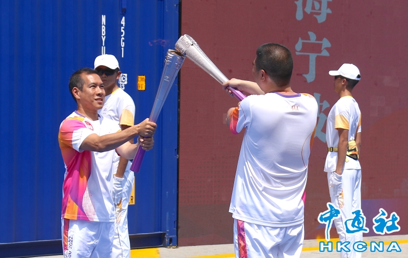 •   9月12日,火炬手李本俊(左)和竺世傑在火炬傳遞中。當日,杭州亞運會火炬在浙江寧波傳遞。 香港中通社圖片