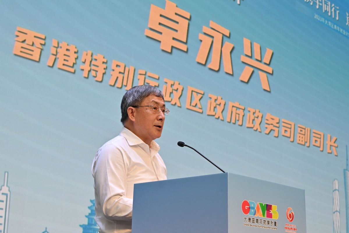 卓永興在儀式致辭。 卓永興上午在2023年“大灣區青年就業計劃”入職歡迎儀式表示,香港特區政府一直致力推動香港青年投入大灣區建設行列,發揮自身所長,服務灣區所需。他衷心感謝廣東省一直以來對計劃的堅實支持,也感謝所有參與計劃的企業,扶助香港青年放遠目光,把握大灣區建設的龐大機遇。
