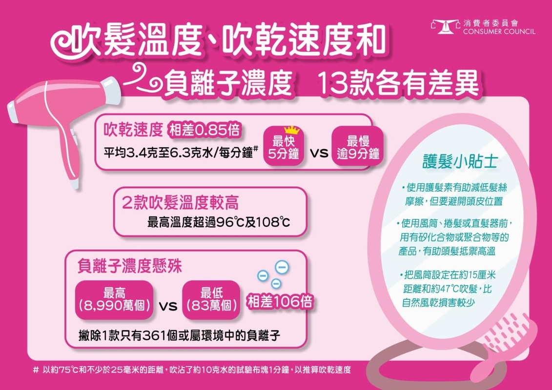 消委會圖片。 另外,樣本間負離子濃度亦十分懸殊。有海外報告指,由於頭髮傾向帶有正電荷,負離子可以中和頭髮表面的電荷,故此能短暫改善髮絲飛散的問題,令頭髮較容易梳理,但不能提供修復髮絲表面的功效。測試結果發現13款樣本量得的負離子濃度,以每立方厘米計算,由361個至8,990萬個負離子。有近4成樣本(5款)均量得超過4,500萬個負離子,屬濃度較高的樣本。而濃度最低的amika風筒只量得361個負離子,跟實驗室以1款沒有負離子功能的對照風筒量得的濃度(約200個至300個)頗接近,有理由懷疑測試所得的負離子為環境中的負離子,而非樣本所產生的。