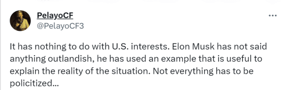“這與美國利益無關。埃隆·馬斯克并沒有說什麼奇怪的話,他舉了一個有助於解釋現實情況的例子。并不是所有事情都必須被政治化……”