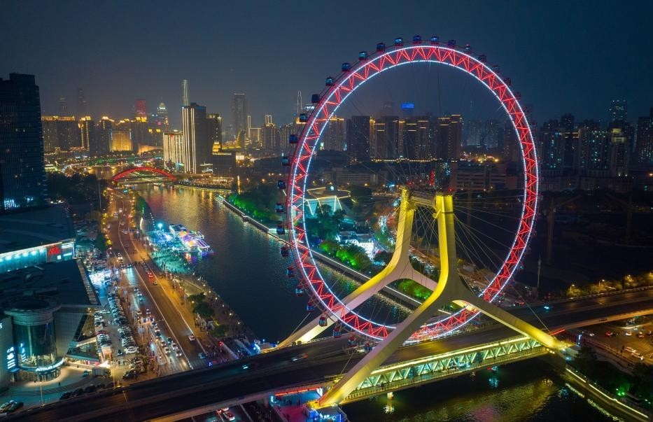 網圖。 【地址】:天津市和平區赤峯道78號及83號 【開放時間】:09:00-18:00 ➢➢第四站:天津之眼 “天荒地老流連在摩天輪 在高處凝望世界流動”。天津之眼是世界上首個橋上摩天輪,橫跨在永樂橋上猶如一隻眼睛。“天津之眼”是天津最著名的地標之一,最高點距離地面達110米高,相當於35層樓的高度,轉一圈需時30分鐘。摩天輪設置了360度透明座艙,能看到方圓40公里的風景,坐在裡面靜靜欣賞周圍開闊景色。特別是天黑後,華燈初上,伴隨著摩天輪舞動的旋律,如夢似幻,享受一刻的浪漫。