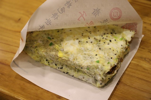 網圖。 隨著時間的沉澱,老炸糕逐漸形成了自己的味道,經久不衰。炸糕一定要吃剛撈出來的,金黃酥脆的外皮伴著軟糯的餡料,讓人滿口留香。“耳朵眼炸糕”在1985年獲天津市命名為市級優質食品。2010年,錄入天津市第二批市級非物質文化遺產名錄。 ➢➢煎餅餜子 以綠豆粉做成漿,如可麗餅般煎熟,再打入雞蛋攤開,塗抹甜麵醬、腐乳、辣椒等醬料後,將餅捲起再裹入油條(又稱餜子)、餜篦(薄片狀餜子)等食材及調料作成的街頭小吃。