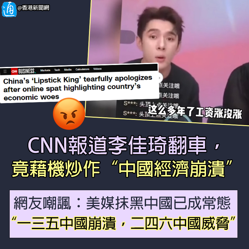 視頻截圖 此番何不食肉糜的言論引發軒然大波!大批網友怒斥李佳琦不尊重消費者,“明明靠賺粉絲的錢發家致富,現在卻來嘲諷粉絲!” 值得注意的是,李佳琦“翻車”風波於內地發酵的同時,也引發外媒關注。然而,部分外媒的報道似乎別有用心。 美國有線電視新聞網(CNN)就發表了一篇名為《中國“口紅一哥”在網上引發口角凸顯國家經濟困境後,含淚道歉》的文章,暗示中國網友不滿李佳琦的主要原因是中國經濟要不行了。 好傢伙,明明是銷售方“飄了”、不尊重消費者而引發的輿論風波,美媒CNN竟將其強行演繹為“中國經濟面臨困境”……至於李佳琦,則是因為爭論不過網友故而“低頭道歉”? “我們必須允許天天直播的人偶爾說錯話。如果我們要求李佳琦做到非凡的冷靜和自制力,他就不再有趣,他的直播間將會變得乾巴巴。如果整個輿論場一起崇尚那樣的嚴厲,將會反噬我們的集體利益。” 文章結尾,CNN還“耐人尋味”地引用《環球時報》前總編輯胡錫進為李佳琦辯護的言論作結,疑似又在暗戳戳地抹黑中國“言論不自由”。 事實上,上述言論雖是胡錫進說的,可CNN並未截取全文,而是掐頭去尾地引用了可以佐證自己觀點的部分。 在上述言論的下一段,胡錫進直言李佳琦確實說了不合適的話,網友不滿是應該的。同時,他亦建議網友接受李佳琦的道歉,鼓勵他吃一塹長一智,今後不斷成熟,尋找他的風格和風趣與應有正確性之間的最大平衡。 而這些卻被CNN“視而不見、見而不報”?因此,CNN這番陰陽怪氣的報道引發網友憤怒! 有中國網友批評美媒用“春秋筆法”抹黑中國,截取各個現象中能支持自己論點的部分,結合成觀點輸出,但與事實相去甚遠! “美媒說李佳琦被網友罵是失去‘言論自由’,那網友就沒有‘言論自由’來發表不滿嗎?”有網友直言美媒“雙標”,所謂“言論自由”不過是拿來攻擊他國的武器。 “一三五中國崩潰,二四六中國威脅……”還有網友嘲諷美媒抹黑中國已成常態。