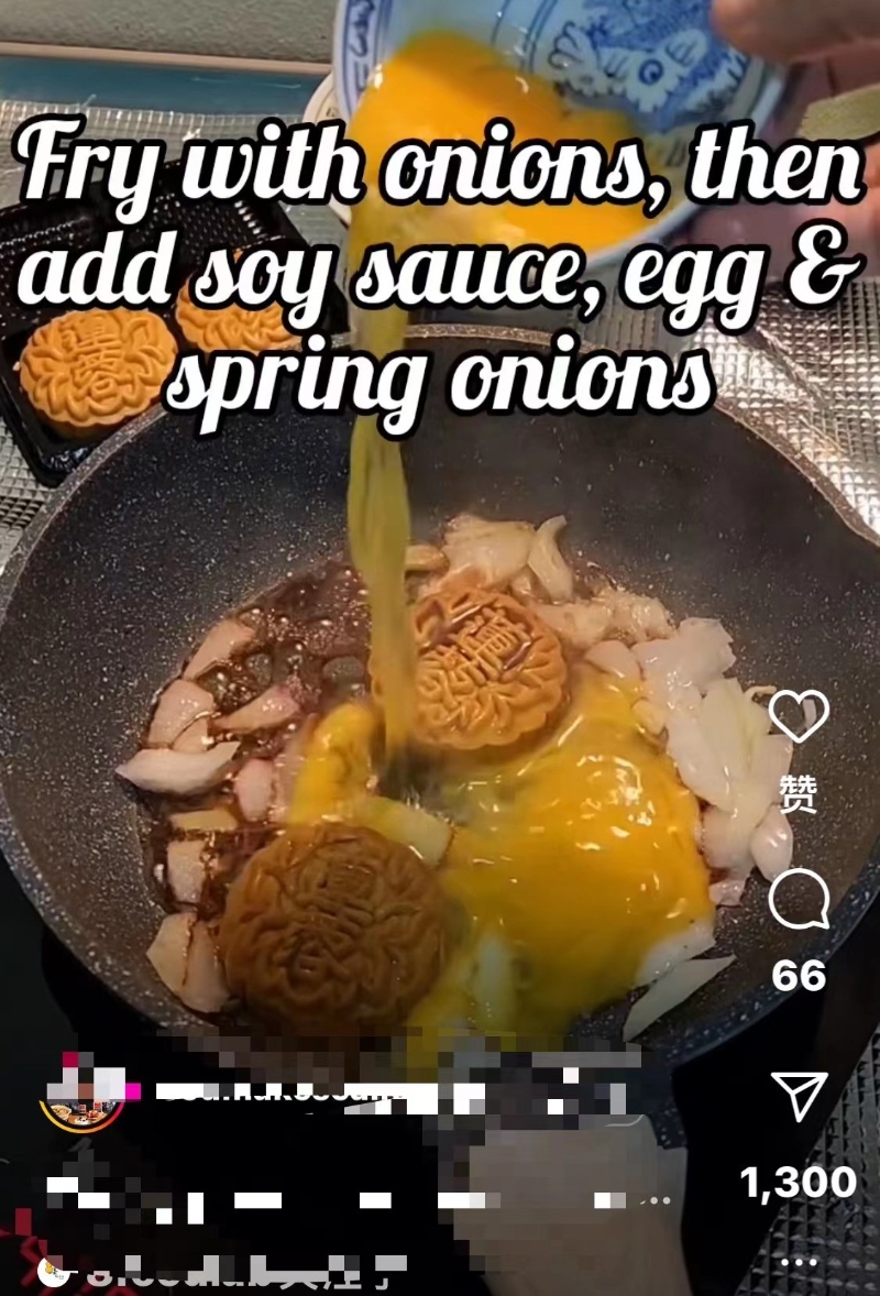 外國網友製作布丁月餅。圖源:TikTok截圖 不過,這個洋蔥煎蛋月餅,有點驚到我了!