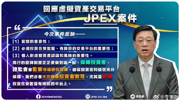 图片来源:李家超微博 有評論指出,JPEX事件中,投資者有一定責任,應在投資前先瞭解產品及相關風險。不過,正如不少人指出,這次涉案的JPEX在香港已經營一段時間,而且有很主流的宣傳廣告,以致令人信以為沒有問題。其中一個關鍵,在於持牌與否的問題。 有不少觀點指出,新修訂的《打擊洗錢及恐怖分子資金籌集條例》(《打擊洗錢條例》)規定,所有在香港經營或積極推廣虛擬資產服務的交易平台,自今年6月1日起須獲證監會發牌,但證監會同時提供了一年的過渡期,而JPEX似乎在鑽這個空子,進行無牌經營。 另外,不少“苦主”聲稱是受到明星或網紅的宣傳才投資JPEX。此次事件也突顯香港有必要立法規管網紅代言活動,以保障消費者和投資者權益。 (完) 【編輯:殷田靜子】