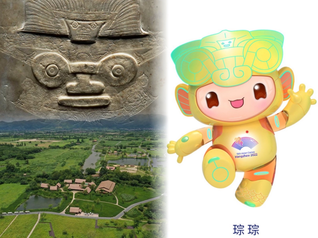 “琮琮”設計靈感源於良渚文明的玉琮,代表世界遺產良渚古城遺址。作為世界文化遺產,它為中華5000多年文明史提供了有力實證。“琮琮”頭部裝飾的紋樣取自良渚文化的標誌性符號“神人獸面紋”,意寓“不畏艱險、超越自我”。