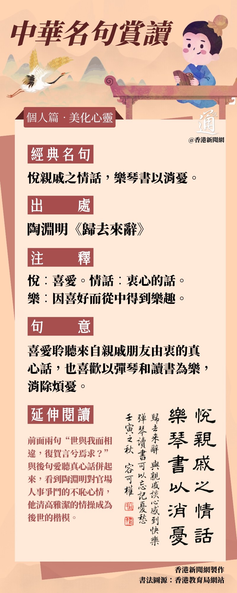 香港新聞網9月27日電 “悅親戚之情話,樂琴書以消憂”是陶淵明《歸去來辭》的名句。 陶淵明被譽為“隱逸詩人之宗”、“田園詩派之鼻祖”, 是江西文學巨匠,他喜愛聆聽親戚朋友由衷的真心話,也喜歡以彈琴和讀書為樂,消除煩憂。 為加強中國文學和文言經典的學習,香港特區政府教育局繼續開展“中華經典名句推廣活動”,從《致知達德》(中華傳統美德語文學習資源)中選取40則名句,作為本學年推廣的內容。香港新聞網“中華名句賞讀”系列今日解讀這句出自陶淵明的經典名句。
