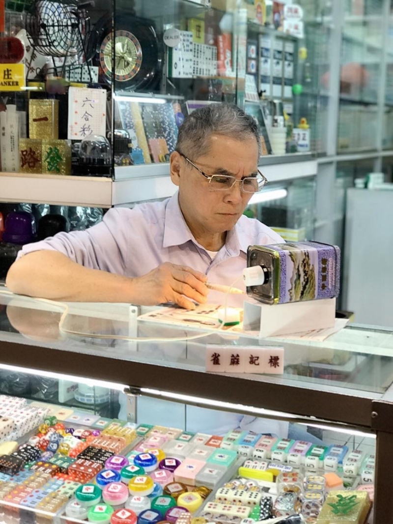 圖源:標記麻雀FB 三代傳承 見證香港麻雀黃金時代 “手雕麻雀”師傅張順景,三代都從事麻雀生意。 他的祖父是打磨師傅,手工刨薄並打磨麻雀至光滑,父親則負責雕牌。對於自小在麻雀鋪長大的他而言,入行似乎是件理所當然的事情。“正因為我家裡從事這個行業,再加上小時候讀書不行,自自然然便傳承手藝。” 張順景入行的時候,正是香港手雕麻雀最盛行的年代。曾經,佐敦一條街就有十多間手雕麻雀店,如今僅剩下一間。即使放眼全港,也僅有約5間同類老店。 張順景回憶,六七十年代時,香港很流行每過年就換一副新牌,店鋪生意非常好,外國人來一買就一百多套,根本不愁生意。 雕刻工藝複雜 一撇一捺皆顯功力 要雕成一副麻雀,張順景先要挑選物料,之後送到內地廠房進行加工切割,送回店內後自己再一刀一筆仔細雕刻,小心翼翼地上色,才製成“四方城”的主角。 他透露自己雕麻雀時,喜歡先難後易,故習慣先雕“萬子”,因“萬子”最多筆劃,最易則“筒子”,惟最易亦是最危險。