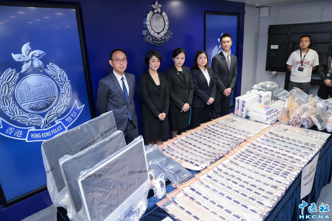 在香港無牌經營的加密貨幣交易平台JPEX涉嫌詐騙。9月19日,香港警方公佈截至18日晚上接獲1641宗報案,指無法從JPEX取回資產,懷疑受騙,涉及12億港元。警方暫拘捕8人。圖為商業罪案調查科高級警司孔慶勳(中)、警司李慕賢(右二)、署理總督察麥偉光(右一)及證監會中介機構部發牌科總監兼金融科技組主管黃樂欣(左二)等出席記者會。(香港中通社記者 謝光磊攝)