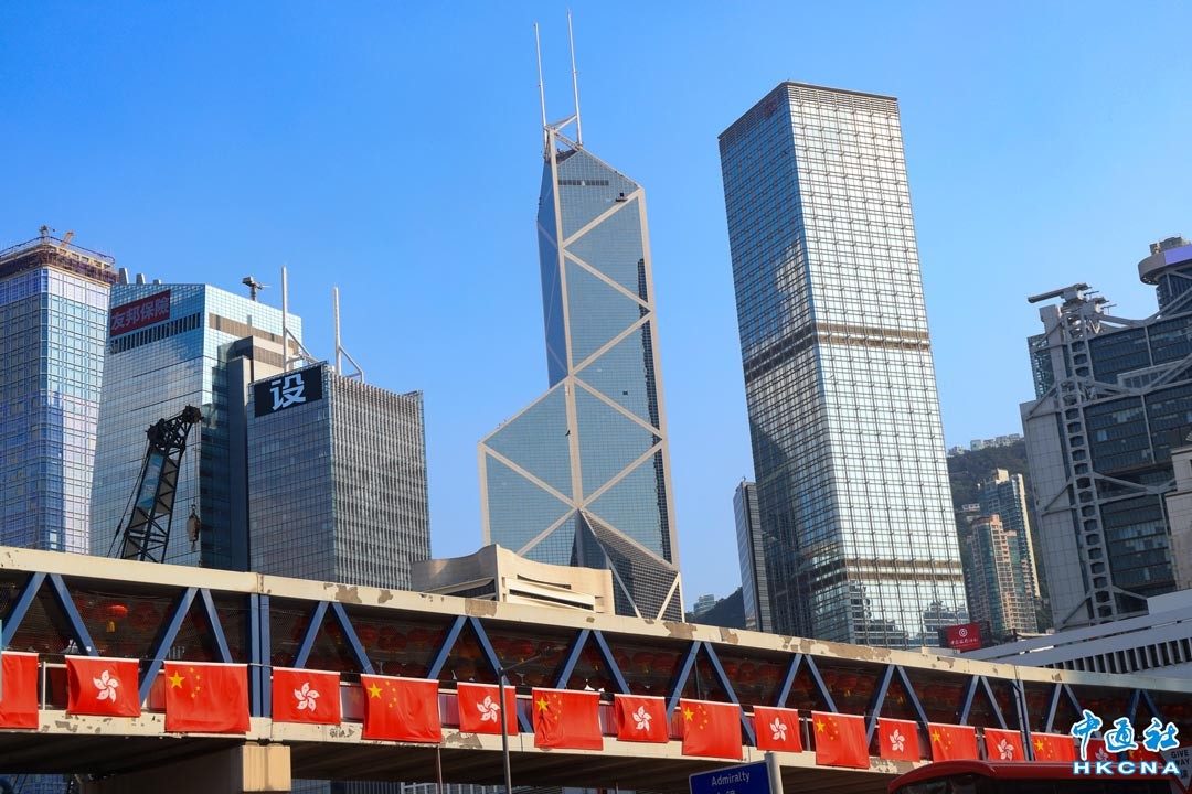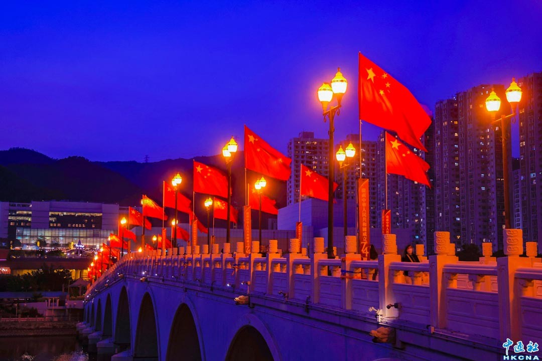 國慶將至,香港沙田瀝源橋掛起數面中華人民共和國國旗,場面壯觀。(香港中通社記者 曹文毓攝)