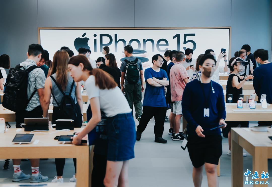 9月22日,Apple iPhone 15系列手機正式開賣。 圖為大批消費者在香港銅鑼灣Apple門市選購新機。 (香港中通社記者 曹文毓攝)